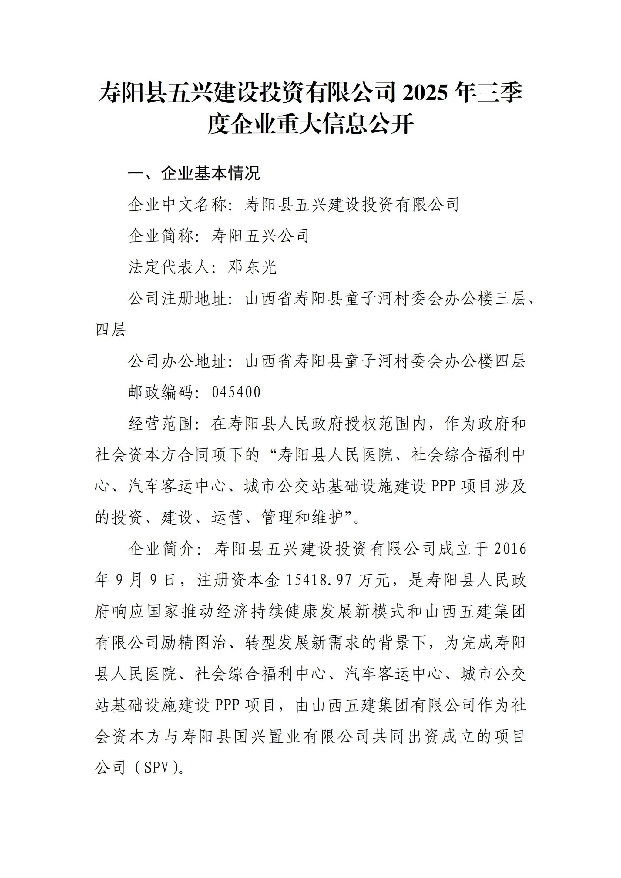 寿阳县五兴建设投资有限公司2025年三季度企业重大信息公开