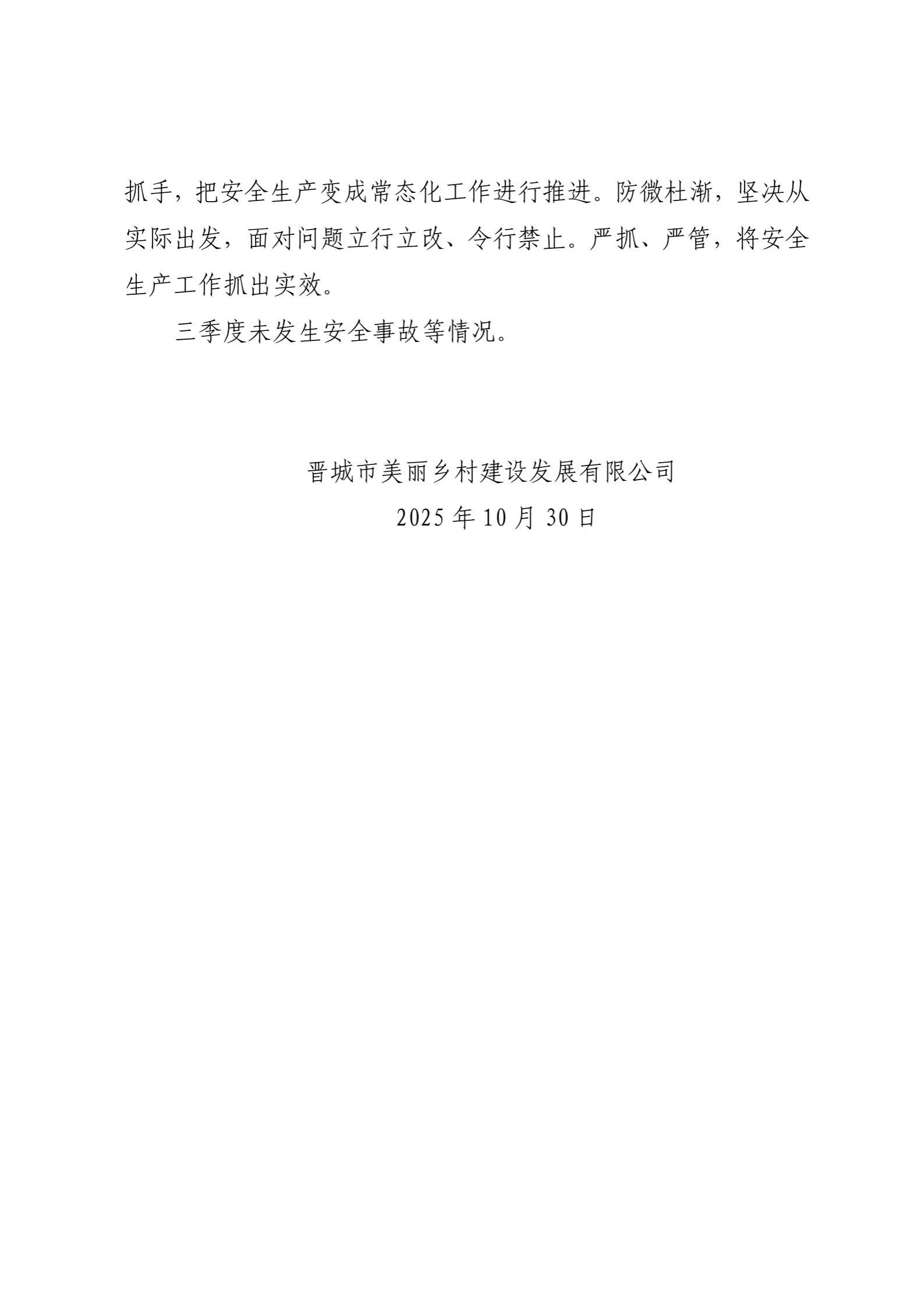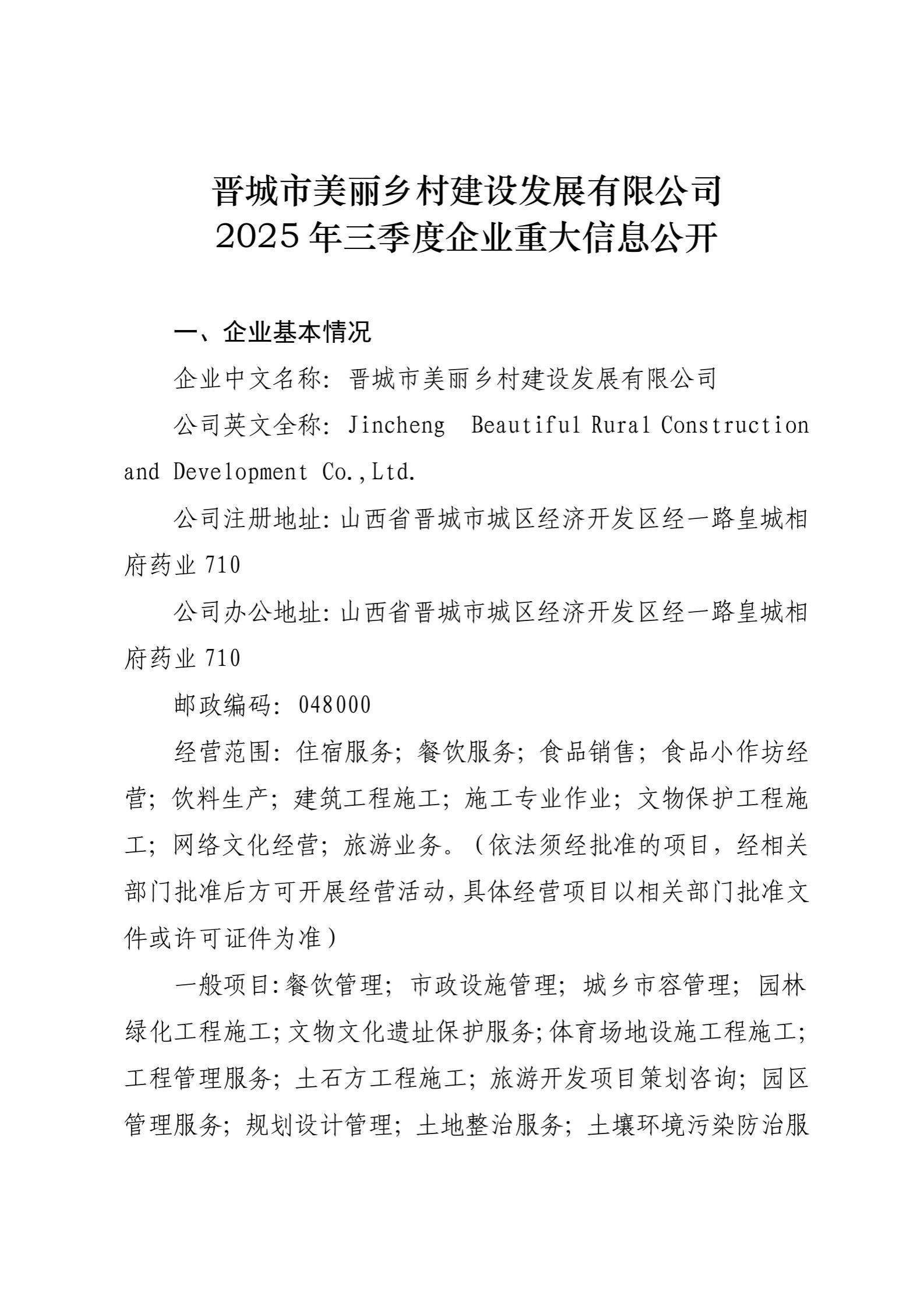 晋城市美丽乡村建设发展有限公司2025年三季度企业重大信息公开